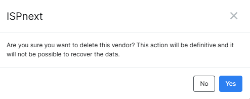 - A pop-up will appear to confirm the deletion. It also warns if there are any contracts registered for the vendor that is about te be deleted and also that deletion is irreversible.