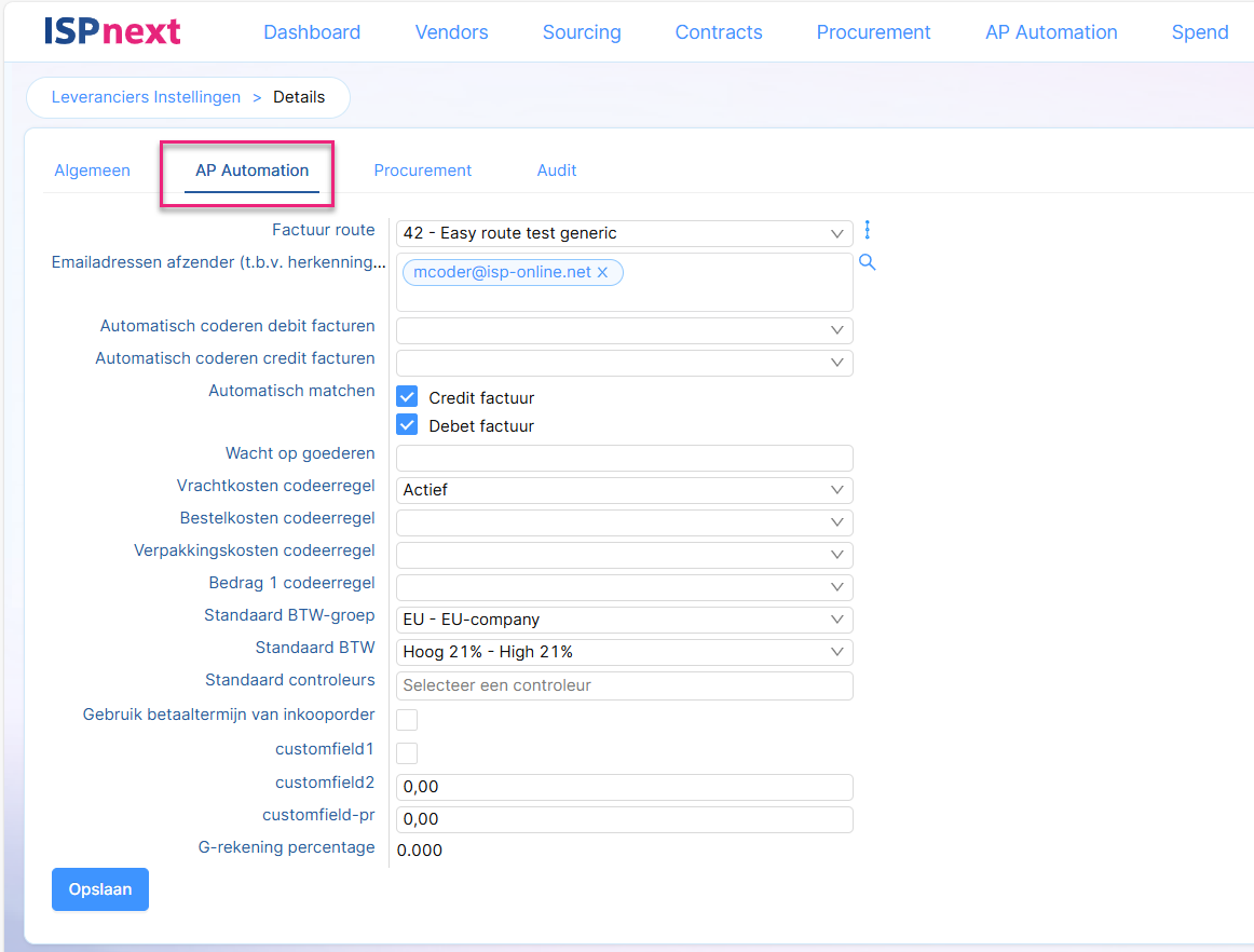 | Factuur route | Hiermee kan een standaard simpele route worden aangewezen als deze leverancier wordt herkend. |