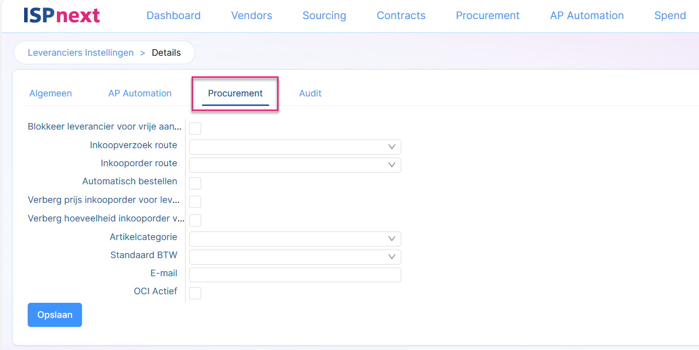 | Blokkeer leverancier voor vrije aanvraag | Hiermee kan een leverancier worden uitgesloten voor een vrije aanvraag in Procurement. Wanneer ingeschakeld is het niet mogelijk om bij de betreffende leverancier een bestelling te plaatsen via een vrije aanvraag. |