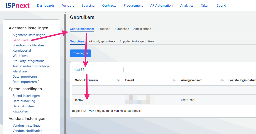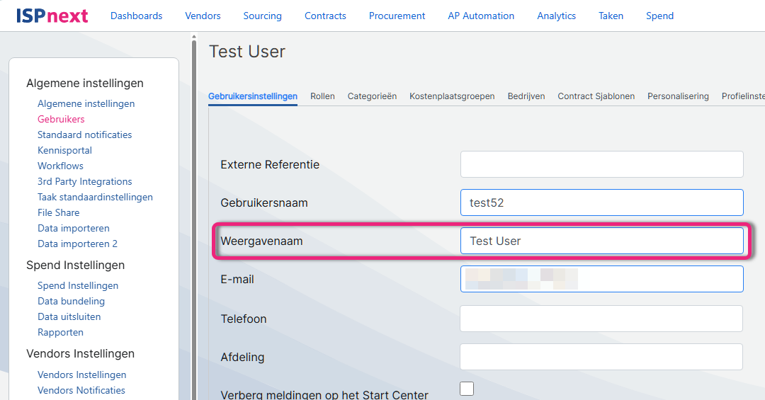 - Ga naar Gebruikers > Gebruikersbeheer en zoek/selecteer de gebruiker waarvoor de weergavenaam aangepast dient te worden.