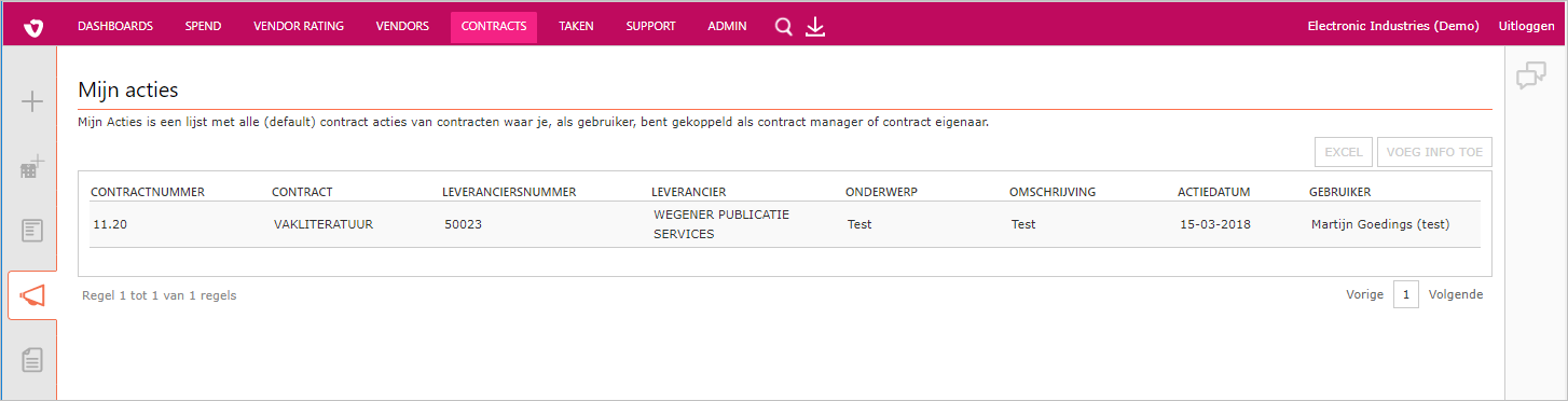 Dit overzicht geeft alle contractacties weer waar de huidig aangemelde gebruiker een rol in speelt, bijvoorbeeld als contractmanager of contracteigenaar.